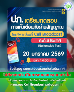 กรมป้องกันและบรรเทาสาธารณภัย เตรียมทดสอบการแจ้งเตือนภัยผ่านโทรศัพท์เคลื่อนที่ ผ่านระบบ Cell Broadcast ระดับประเทศ