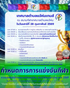 ขอเชิญชวนพี่น้องประชาชนทุกท่าน ร่วมเป็นกำลังใจและเข้าร่วมกิจกรรมการแข่งขันกีฬา เทศบาลตำบลแจ้ห่มเกมส์ ประจำปี 2569
